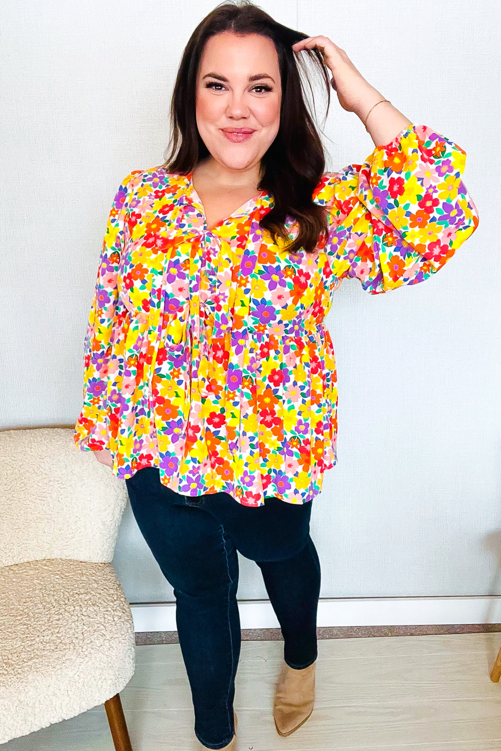 Donning front ribbon tie bows and trendy three-quarter puff elastic bubble sleeves, this floral print babydoll woven top offers a flattering silhouette. Wear with all your denim.