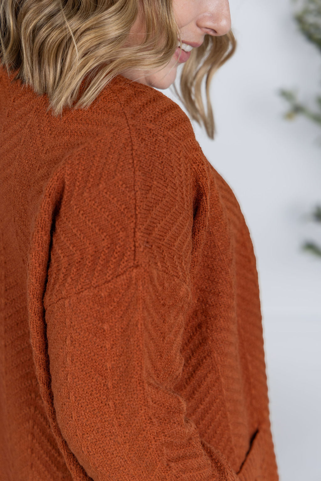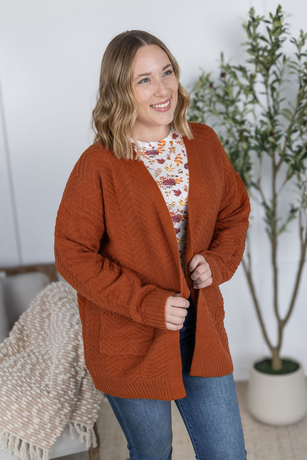 Take on the fall season with a bold attitude in our Billie Open Knit Cardigan. Its fun chevron pattern and rust color will add a touch of adventure to any outfit. With the added benefit of pockets, this open knit cardigan is perfect for taking risks and embracing the changing seasons.