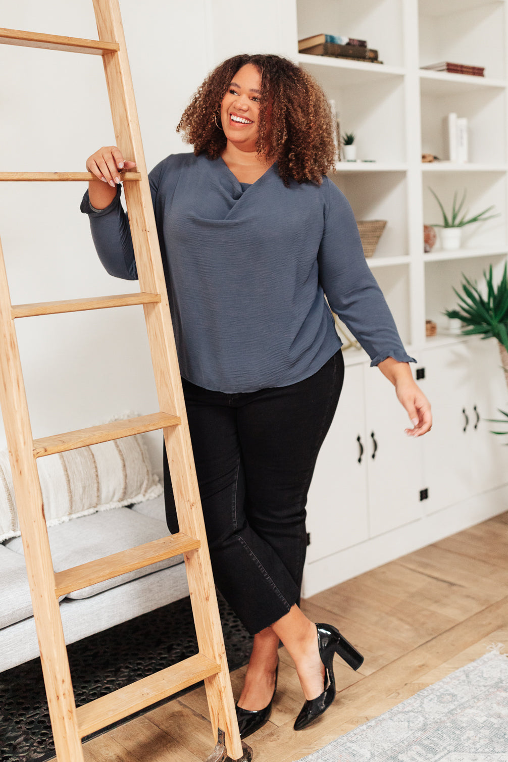 Let the City Girl Blouse complete your outfit! This chic top features a cowl neck and ruffle elastic sleeve cuffs, that shape a flowy silhouette. We are obsessed with the way this top looks with leather, whether it be pants or a skirt, we just can't get enough!