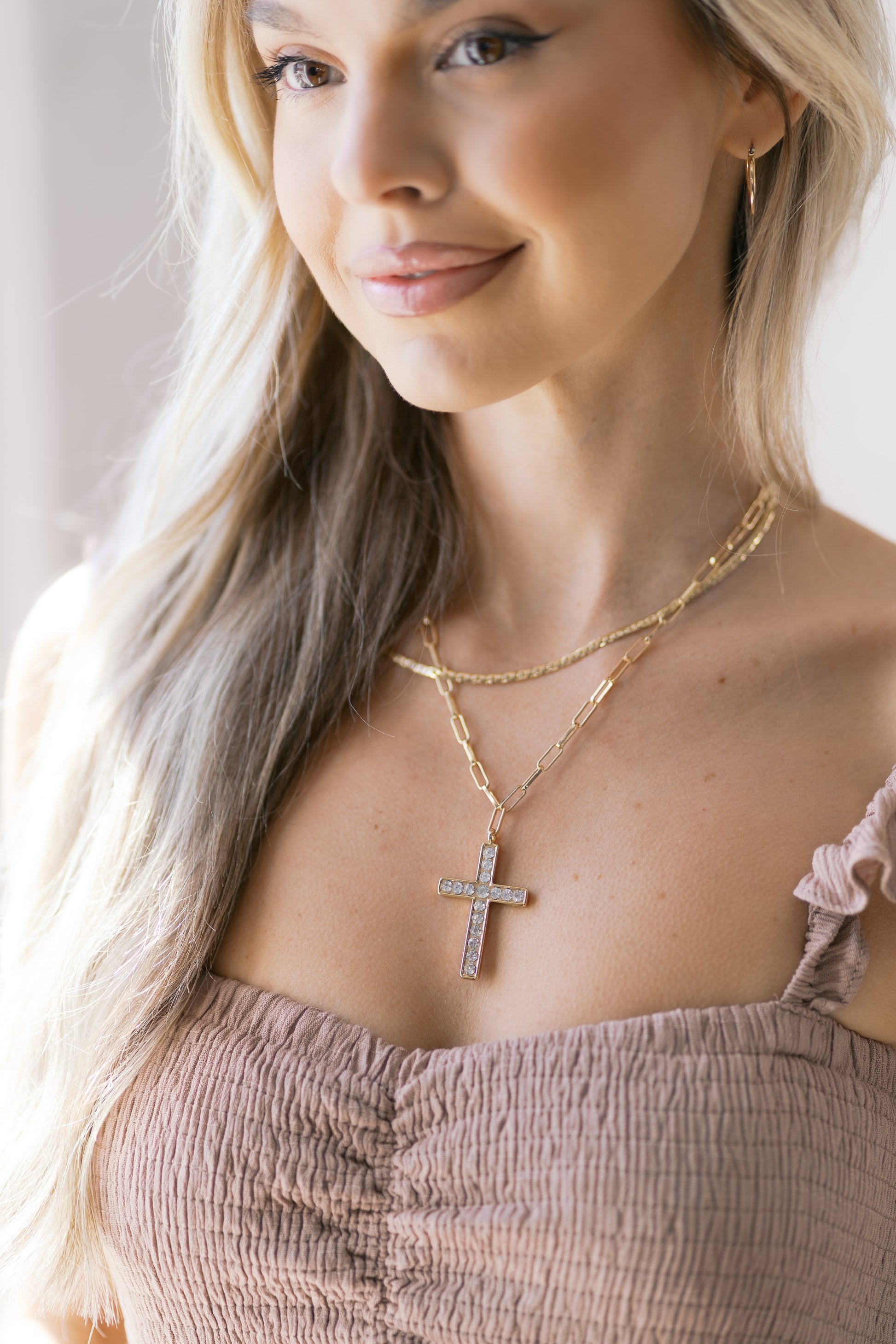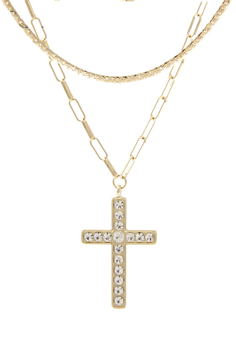 Add some heavenly style to your look with the Faith & Grace Layered Necklace. This necklace features both a double chain and a stunning Latin crystal cross pendant, measuring 1.75 inches. With a length of 18 inches, this necklace is perfect for layering and adding a touch of elegance to any outfit.