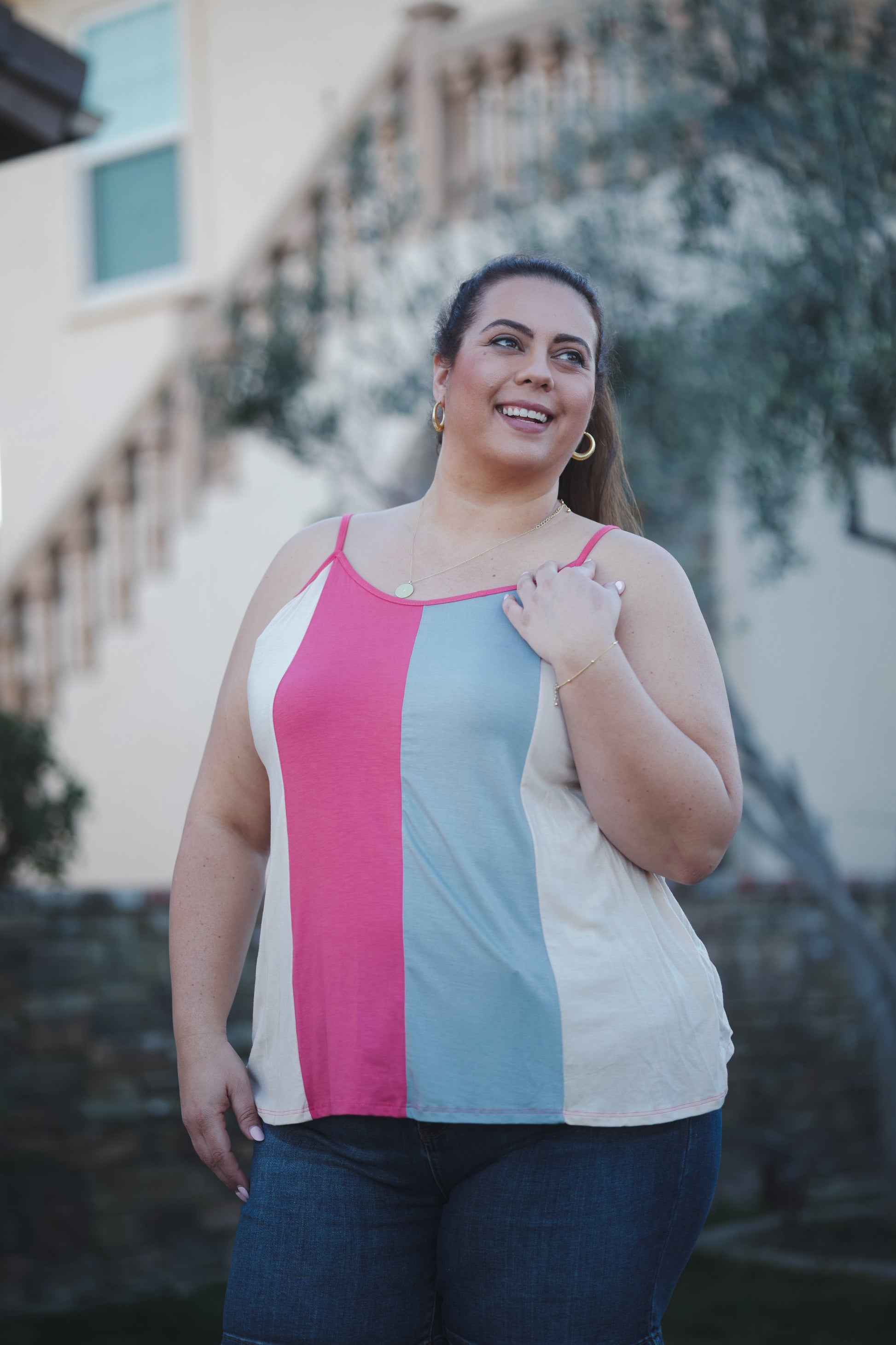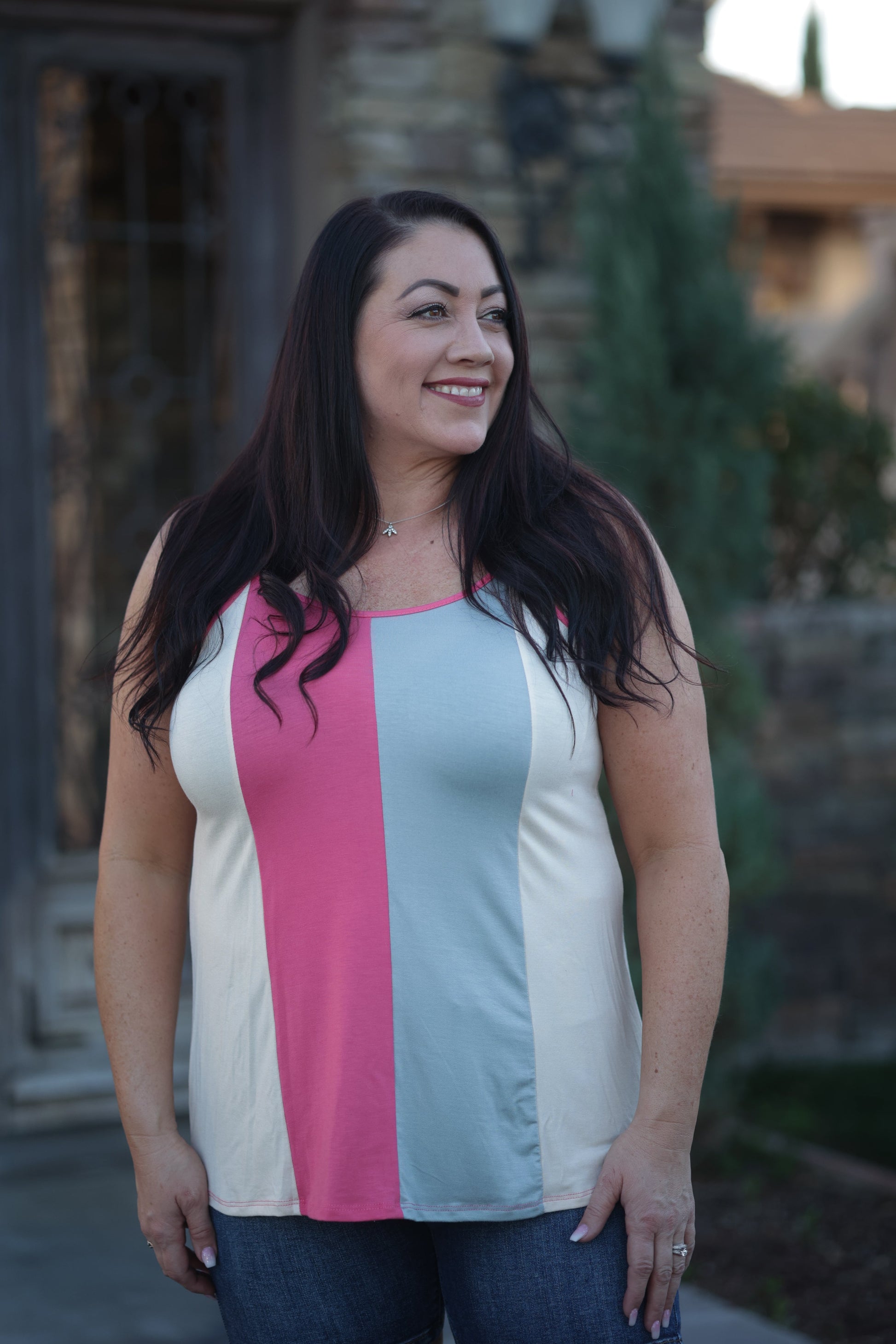 This tank is giving us total beach vibes with the coral, grey and taupe colorway. With a relaxed fit, this tank features a v-neck and rounded hem.