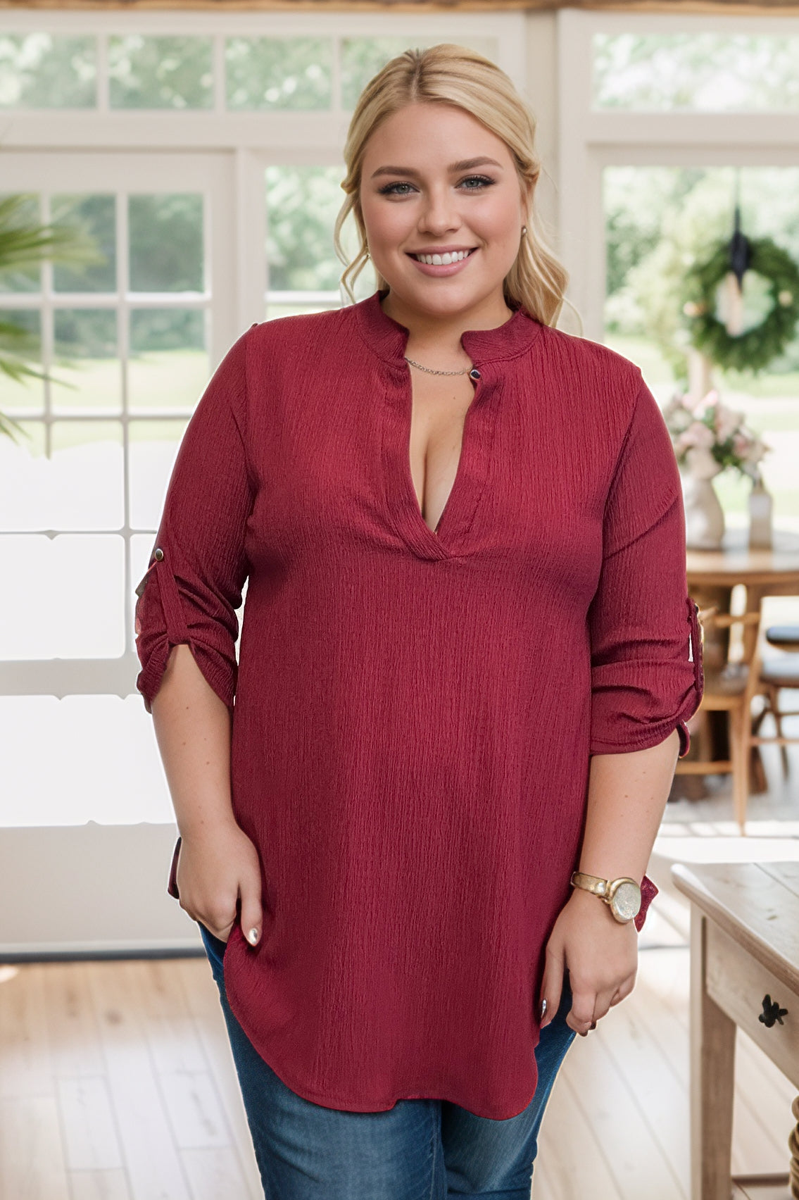 Unwind in style with Merlot Dreams - Gabby. This v-neck top features a mandarin collar and three quarter sleeves, perfect for any occasion. The gold button details and textured fabric add a touch of elegance to your wardrobe. Cheers to fashion!
