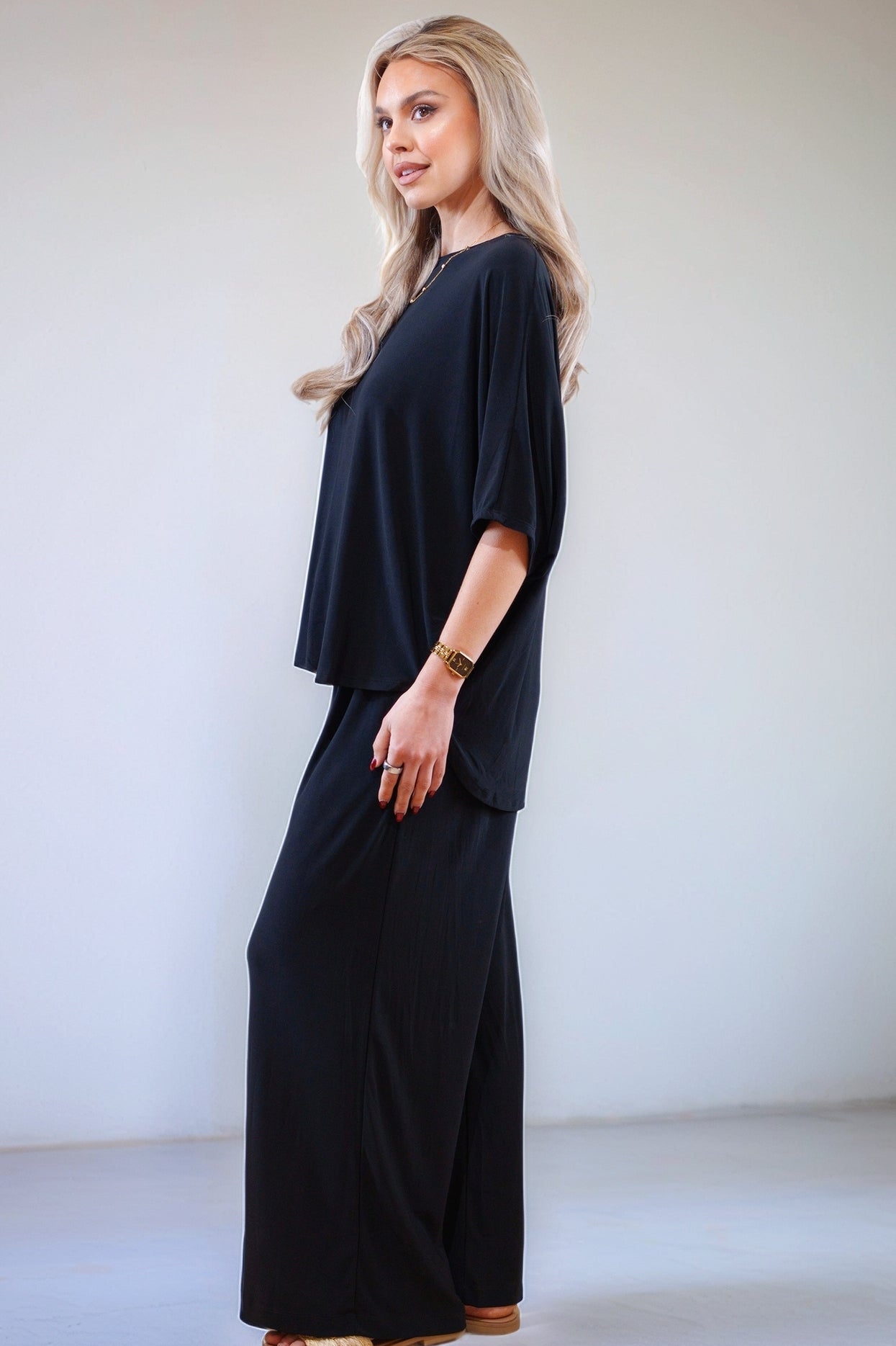 Be travel-ready and chic in our Onyx Storm Set! This two-piece set features a wrinkle-free poncho-like tunic and flowy, wide-leg pants. With an elastic waistband for a comfortable and flattering fit, it's perfect for any journey. Say goodbye to cramped flights and hello to relaxed charm!