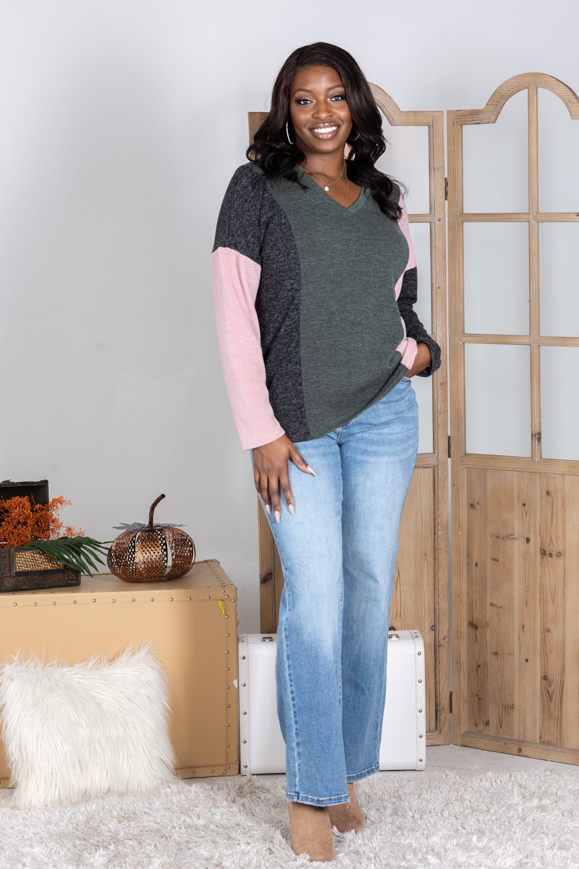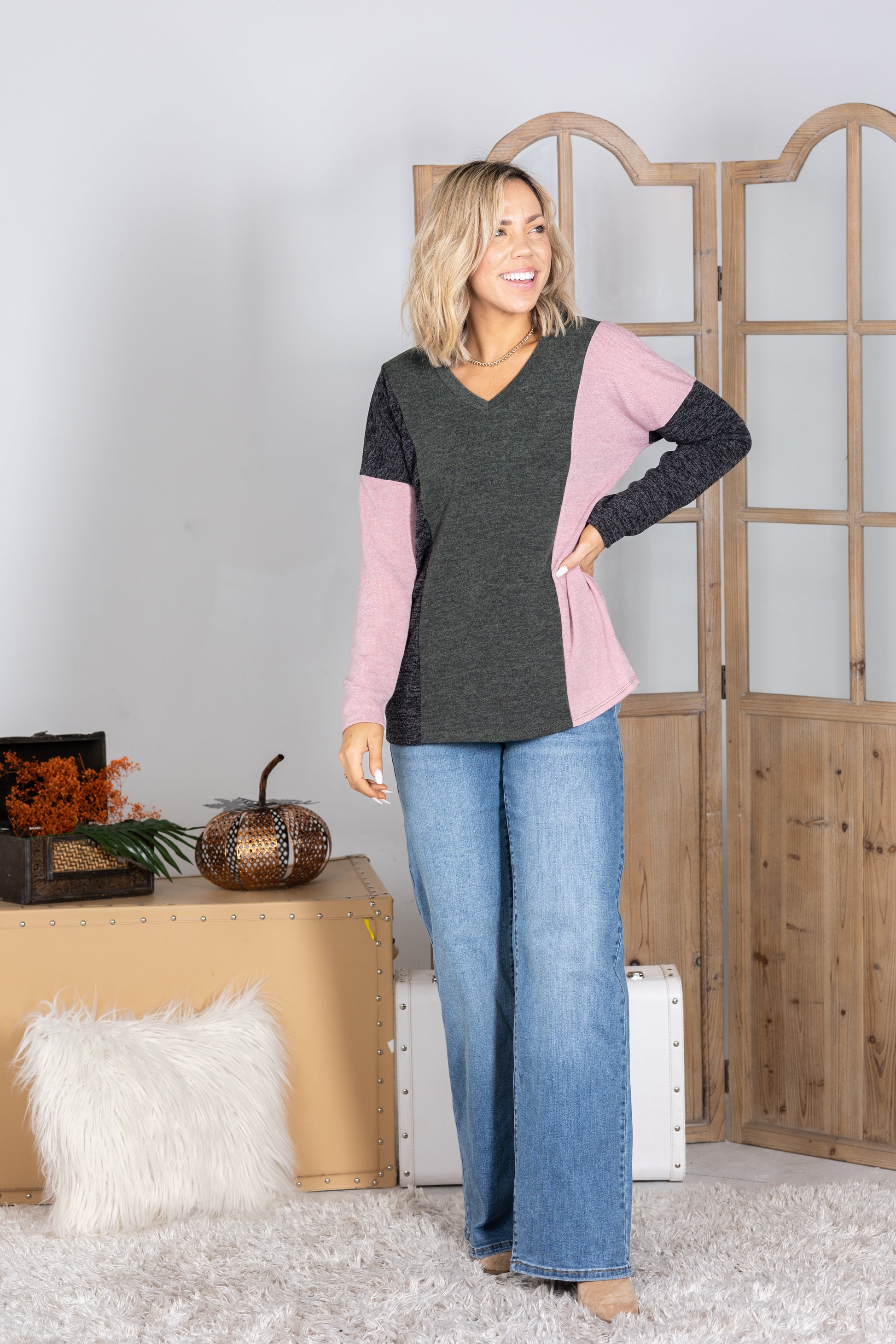 This long sleeve includes a V-neck featured in green/heather grey/pink. The perfect fall colorblock long sleeve for all occasions.