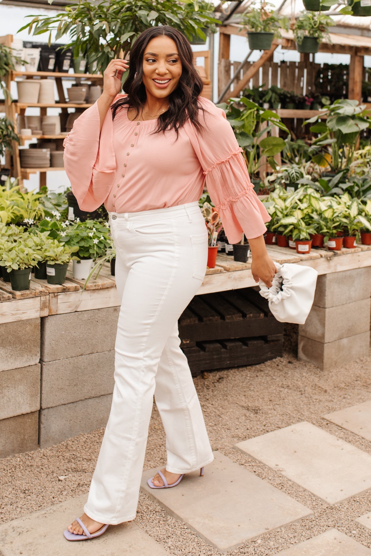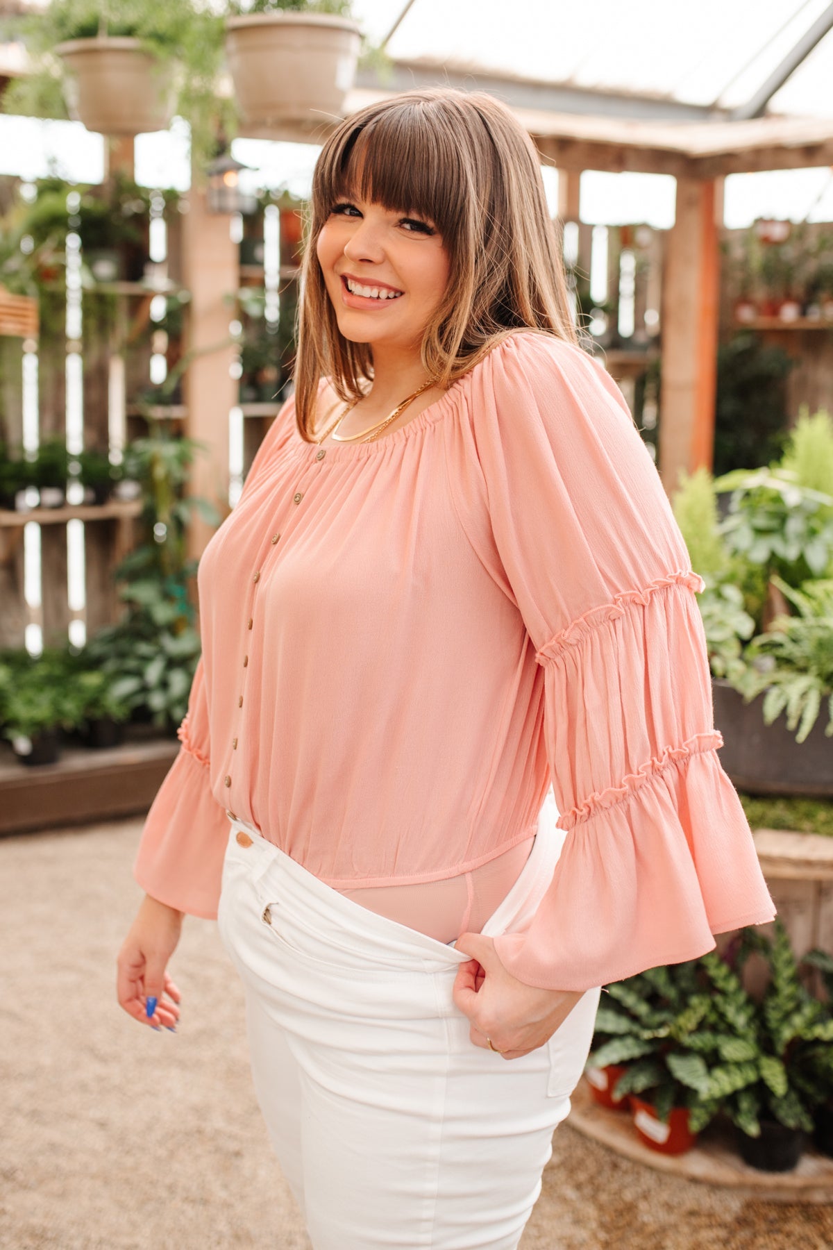 The Sunset Sailing Bodysuit has a dreaming of summer nights spent on a yacht! This stunning top is composed of an off shoulder silhouette, a button placket down center front, and bell sleeves with a dainty ruffle detail, all shaped from a lightweight gauzy fabric.