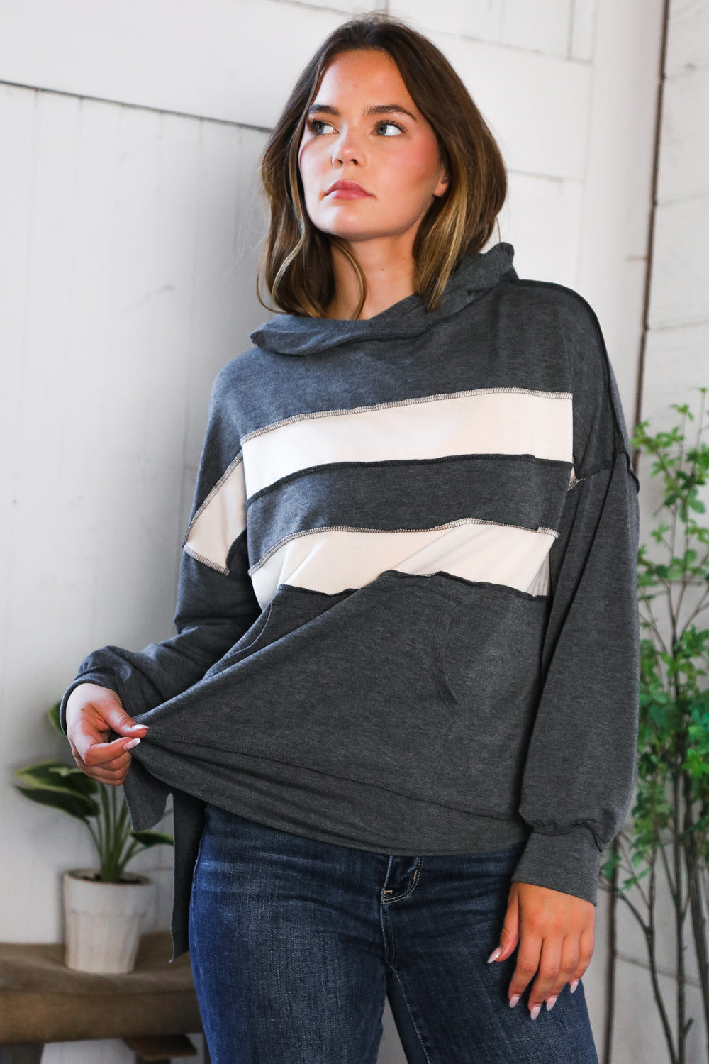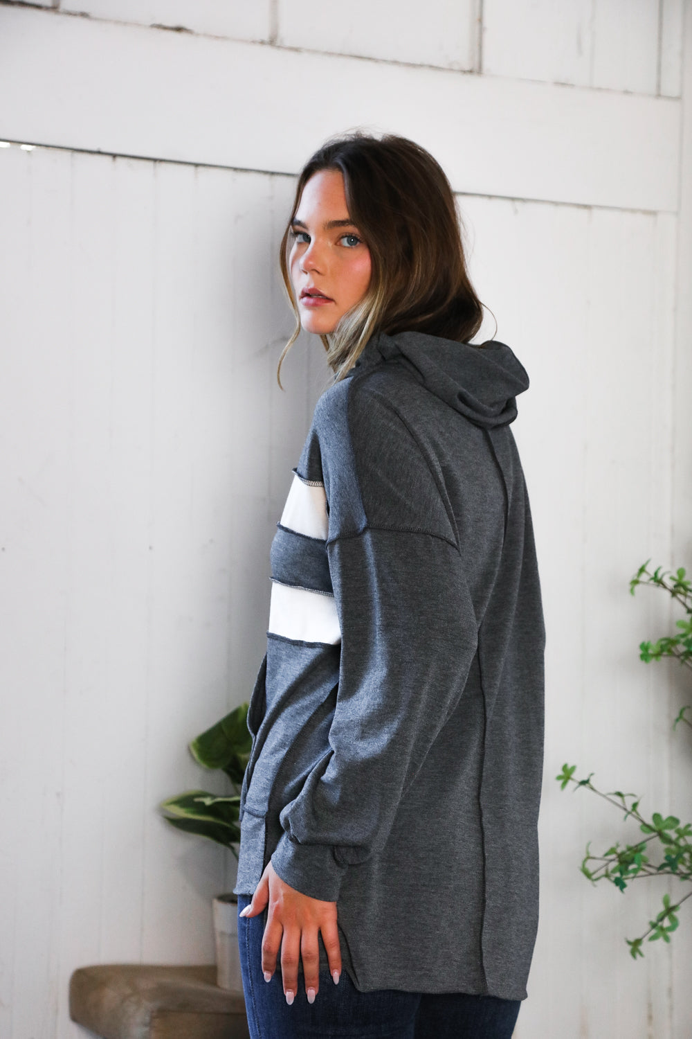 This hoodie is just one of those pieces you end up wearing all the time. It’s got that soft charcoal gray fabric with two cream stripes across the chest that give it a fun sporty vibe. The fit is relaxed but not sloppy, with a front pocket to keep your hands warm or toss in your phone. We love that the hem is a little longer in the back for extra coverage and the reverse seam detail gives it that lived in feel. Perfect for throwing on with your favorite jeans for running errands or school drop off on chilly mornings.
