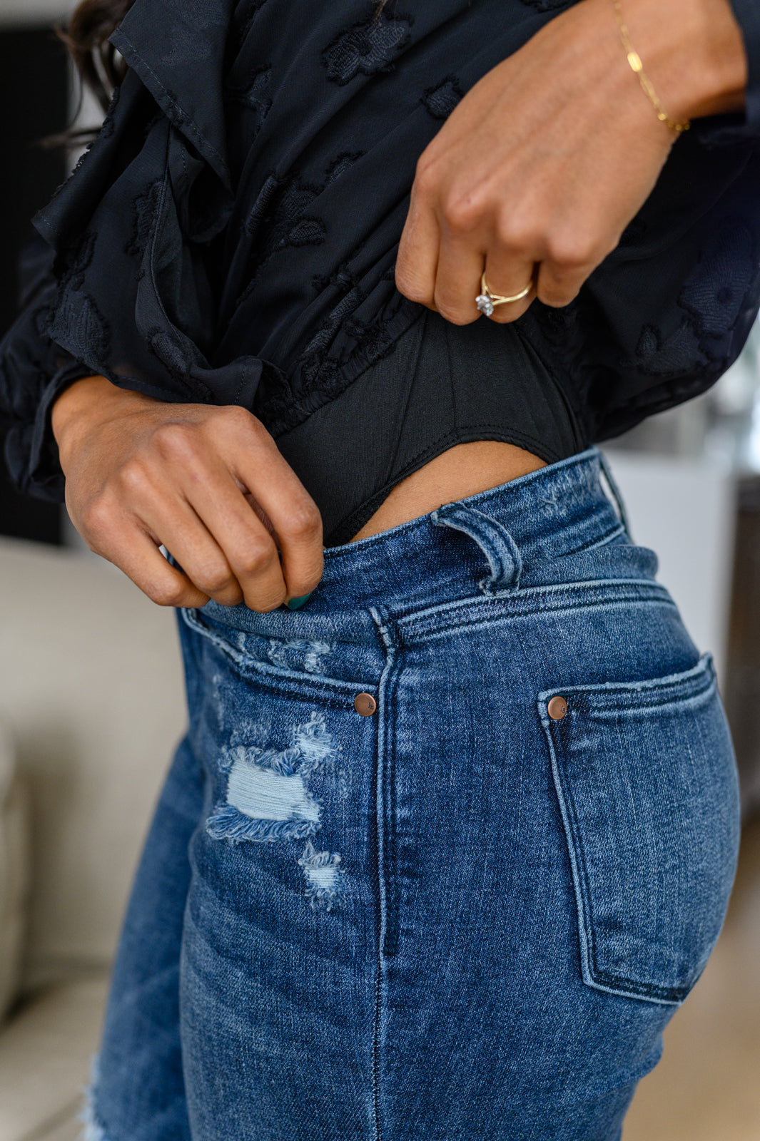 - Christine High Contrast Slim Bootcut Destroyed Jeans